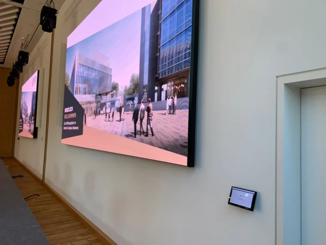 Die komplette Mediensteuerung sowie das Monitoring der Technik in allen Räumen erfolgt über NDpro von Planspur. Die individuell konfigurierten Touchpanels ermöglichen eine benutzerfreundliche und zuverlässige Bedienung aller Systeme. Ergänzt wird das System durch digitale Türschilder von ProDV, Digital Signage via Easescreen und IPTV-Anbindung mit ZeeVee und Dreambox-Komponenten.